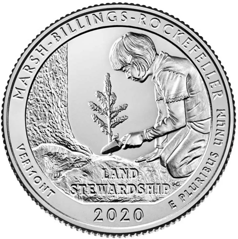 The reverse design depicts a young girl planting a Norway spruce seedling near an established tree, continuing the life cycle of the forest. The site is the only national park dedicated to telling the story of conservation history and the evolving nature of land stewardship in America. The inscriptions read “Land Stewardship”, “Marsh-Billings-Rockefeller”, “Vermont”, “2020”, and “E Pluribus Unum”.