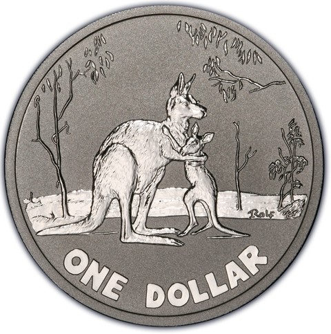 Within a plain border, the reverse depicts a mother and a joey in a hug, with trees in the background. On the grass on the right, the signature of the artist (Rolf ). Around below, the face value ONE DOLLAR.
