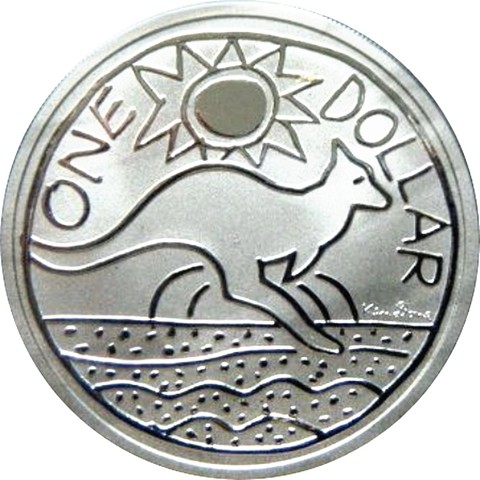 Within a plain border, the reverse of the coin depicts a cartoon-style kangaroo leaping to right, with the sun above and the outline of Uluru behind, the designer's signature (Ken Done) below right, the face value ONE DOLLAR in hand-written script around above .