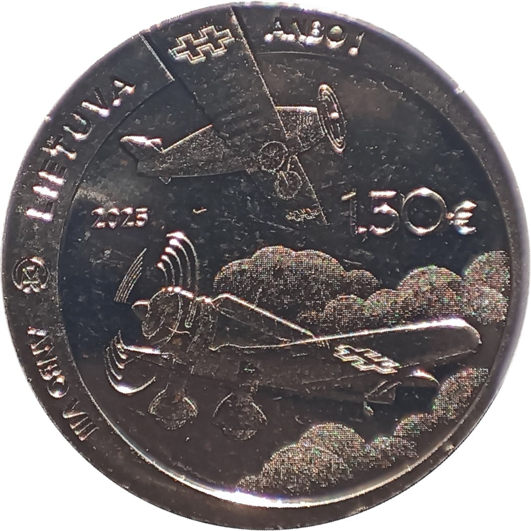 Stylised models of ANBO aircraft and the double cross (insignia of Lithuanian Air Force). In a semicircle are titles of aircraft “ANBO I” and “ANBO VIII”, the inscription “Lithuania” (Lietuva) and the mintmark of the Lithuanian Mint. The denomination (€1.50) and the year of issue appear next to the models.