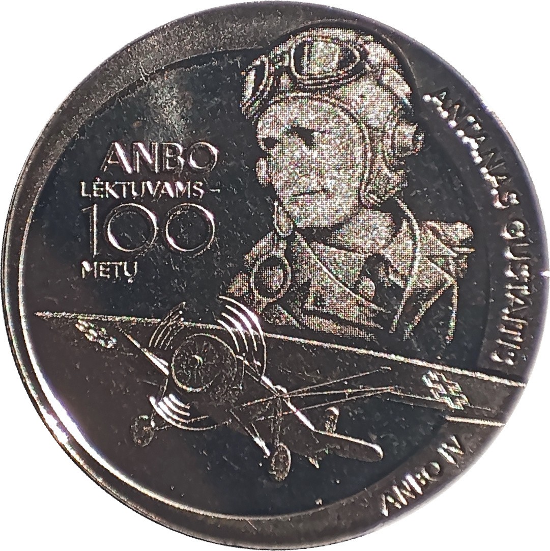 Inscription "ANBO aircraft – 100 years" (ANBO is an acronym for Antanas Nori Būti Ore, Antanas wants to be in the air). It also features a portrait of the aeronautical engineer who laid the foundations of aviation in Lithuania, a stylised model of a military aircraft, as well as the inscriptions “Antanas Gustaitis” and “ANBO IV” arranged in a semicircle.