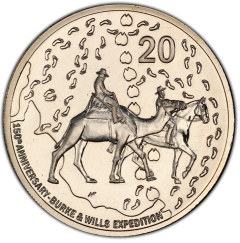 The reverse shows Burke and Wills riding a camel and a horse. All around them are barefoot human footprints leading in all directions, symbolizing the local Aboriginal people who have already explored the place; camel footprints head north, symbolizing the direction of the first half of the journey. To the right, above the two figures, the numeral value value 20. Along the rim below left, the text of event "150th ANNIVERSARY - BURKE & WILLS EXPEDITION". The designer's initials WP are in the lower left field, between the camel's hoof and the letter W of WILLS.