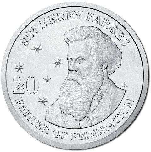 The reverse depicts a portrait of Sir Henry Parkes facing three-quarter left, 5 Stars of the Southern Cross to the left, the face value "20" to the left surrounded by the inscription "Sir Henry Parkes" above and "Father of Federation" below.
