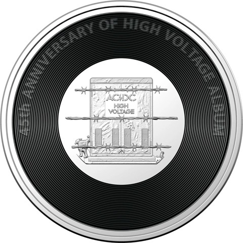 The reverse shows at its centre the artwork from High Voltage - the first album of AC/DC, issued in Australia only in 1975 and then internationally in 1976. Depicts, behind barbed wire, a transformer labelled AC/DC High Voltage. A dog has irreverently raised its leg next to it. surrounding the center, a black ring printed over fine, concentric circles representing the grooves on a vinyl record. Inscribed on that, around above: 40th ANNIVERSARY OF HIGH VOLTAGE ALBUM.