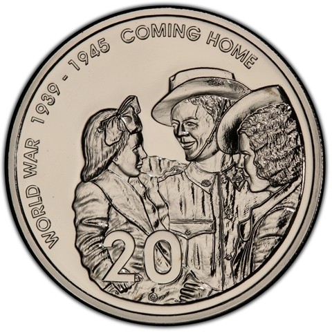 The reverse design was modeled on a photograph from the Australian War Memorial and after a nationwide search it was found that the young girl in the design is Jaquie Dowling and her mother Lorna greeting Private William Leslie Darcy, an ex Prisoner of War on his return home in 1945. The inscription of the event "WORLD WAR 1939 - 1945 COMING HOME" along the rim. The Gottwald's stylized (G) signature below the 20 face value.