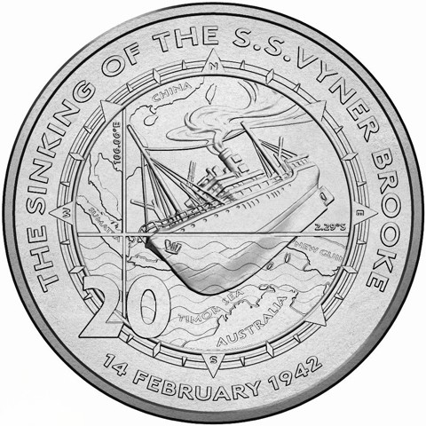 On the reverse, latitude and longitude are marked to the left of an image of the ship sinking in a mapped Timor Sea, with China, Sumatra, Australia and New Guinea also identified, the scene framed within a compass-like border. The denomination numeral 20 also appears, with the date of the sinking and an inscription identifying the theme, THE SINKING OF THE S.S. VYNER BROOKE, on the rim.