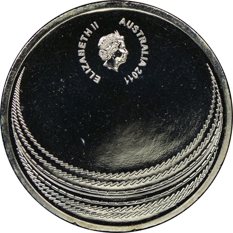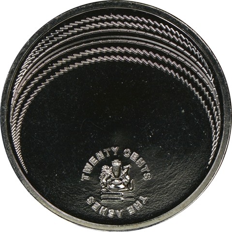 The reverse also symbolizes a cricket ball, with small lines in six concentric curves around above stitching as on the ball. In a small circle below, the value and denomination TWENTY CENTS above, and the text THE ASHES around below, surround a logo depicting a lion and a kangaroo holding a trophy cup, above two cricket bats.