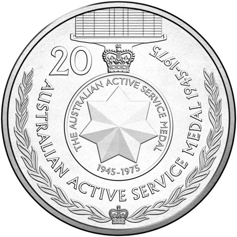 On the reverse, the obverse of Australian Active Service Medal , (has a Federation Star within a wreath of mimosa surrounding the inscription 'FOR ACTIVE SERVICE' above and date below "1945-1975"), The denomination numeral 20 also appears at the upper right below ribbon, with the date and an inscription identifying the theme, THE AUSTRALIAN ACTIVE SERVICE MEDAL around, surrounded by a laurel wreath.