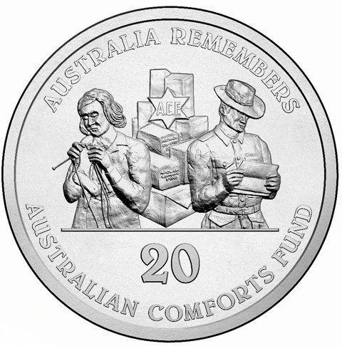 The reverse design shows a woman knitting a sock on the left, and a soldier reading a letter on the right. Behind them, care packages, overlaid on which a badge in the form of a six-pointed star inscribed with A.C.F. surrounded by the inscription the inscription "AUSTRALIA REMEMBERS: above and "AUSTRALIAN COMFORTS FUND" below, the face value 20 is below the exergue line.