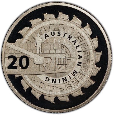 The reverse design features a bucket wheel excavator commonly used in large open-cut mines. These machines are known as the largest land vehicles in the Guiness Book of World Records and the wheel can measure up to 20 meters in diameter and have as many as 20 buckets, the face value 20is placed at the right.