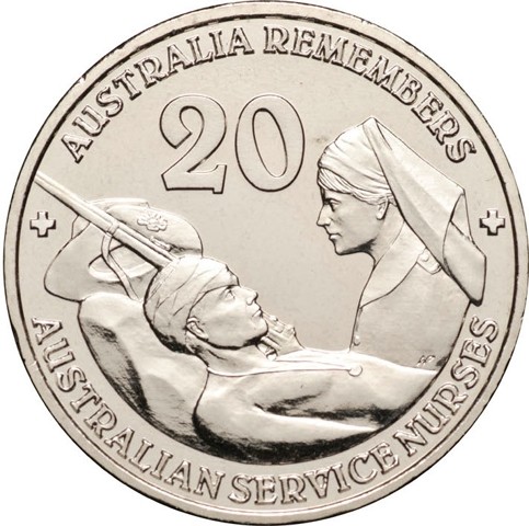 The reverse shows a nurse bringing comfort and assistance to a wounded "Aussie Digger" (Australian soldier). surrounded by the text AUSTRALIA REMEMBERS above and + AUSTRALIAN SERVICE NURSES +below. Above the two figures, the numeral face value 20. The designer's initials WP is seen in tiny letters on the lower right part of the nurse's figure.
