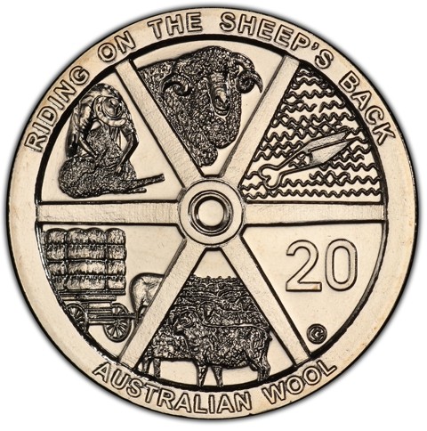 The reverse depicts a wagon wheel illustrated with a series of images representing Australia’s rich history of wool production (from top clockwise): a merino ram with full fleece, hand shears on a background of wool, the face value 20, roaming sheep, bales of wool on a horse-drawn cart, a sheerer sheering a sheep. On the wheel rim, around above the text RIDING ON THE SHEEP'S BACK; around below, AUSTRALIAN WOOL The designer's initials G is embedded in a circle under the face value.