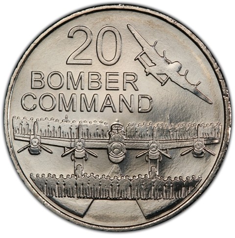 The reverse features Avro Lancaster commonly known as the Lancaster Bomber with its four engines on the ground, on front of and behind it crewmen standing. Another one flying and turning above at the right side and at the left inscription (BOMBER COMMAND) in two lines and the denomination (20).