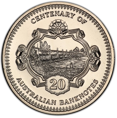 The reverse depicts a view towards the Goulburn Irrigation Weir in Victoria with a small human figure in the foreground, as seen on the 1913 ten-shilling Australian banknote, the face value 20is placed below, in the frame surrounding the image, surrounded by the inscription CENTENARY OF above and AUSTRALIAN BANKNOTES below.