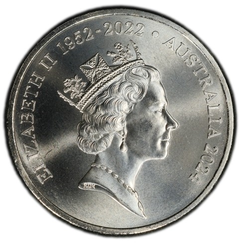 Third crowned portrait of HM Queen Elizabeth II facing right, wearing the George IV State Diadem. Around above , the dates of the Queen's reign 1952 - 2022 and the coin's date of mintage inscribed below.