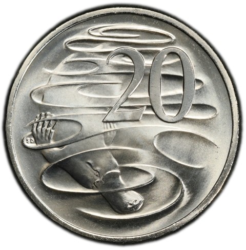 The reverse depicts a platypus swimming. The denomination numeral 20 is above the head of the animal; the designer 's initials SD are in tiny letters, within the swirl of water around its right forepaw.