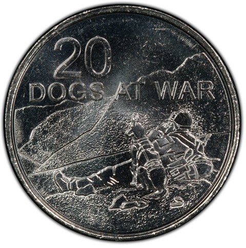 The reverse features an Australian soldier lying on his side with dog wears a tactical military vest, standing in a field, looking alert and ready. Inscription (DOGS AT WAR) and the denomination (20) above.