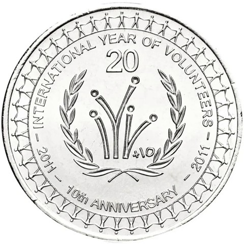 The reverse brings the logo first seen on the 2001 International Year of Volunteers one dollar coin, with an added small +10 at the base and a ring of small figures (representing volunteers) holding hands around the rim. The face value 20 is above the logo. Around, INTERNATIONAL YEAR OF VOLUNTEERS 2011 - 10th ANNIVERSARY - 2011.