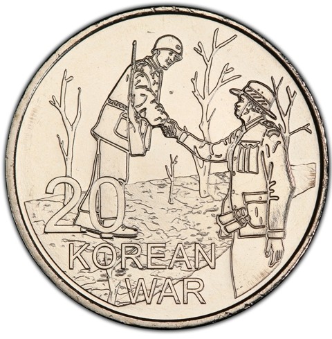 The reverse depicts Australian indigenous Captain Reg Saunders wearing a slouch hat shaking hands with a South Korean soldier wearing gleaming white helmets emblazoned with a star walking through a road with trees without Leaves. Inscription (KOREAN WAR) in two lines and the denomination below.