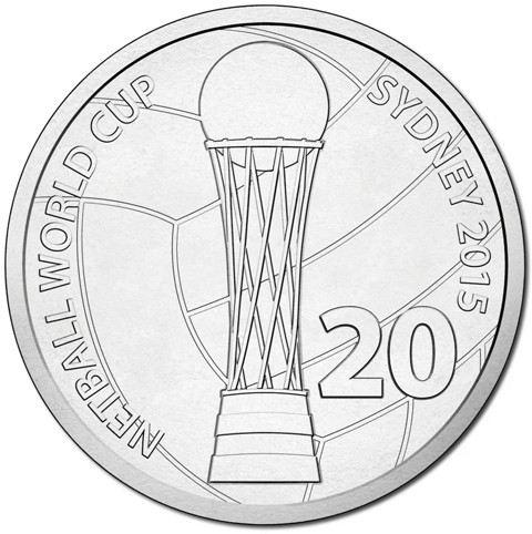 The reverse features the World Cup trophy superimposed on an actual Netball surrounded by the inscription :NETBALL WORLD CUP" at the left and "SYDNEY 2015" at the right, The face value "20" below at the bottom of cup.