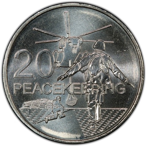 The reverse features two Australian Peacekeeping soldiers one assisting in a supply drop by a Chinook helicopter and other protecting drop behind sandbags. Inscription (PEACEKEEPING) and the denomination in large letters in the middle.