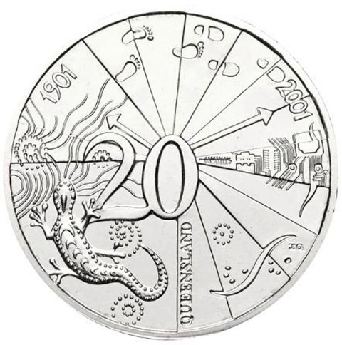 The coin uses as a timeclock of Australian history beginning with a stylized gecko (Australian lizard) leaving ripples in the water. The "hour" hand of time points to Federation in 1901 and footprints turn to shoe prints in the sand depicting the lasting impression of our journey. The "minute" hand points to the Centenary of Federation date of 2001 above a depiction of a computer circuit board denoting the age of technology and its role into the future. The name of the state QUEENSLAND is vertical below the denomination 20. The designer's initials JG are located near the rim in the bottom right part of the coin.