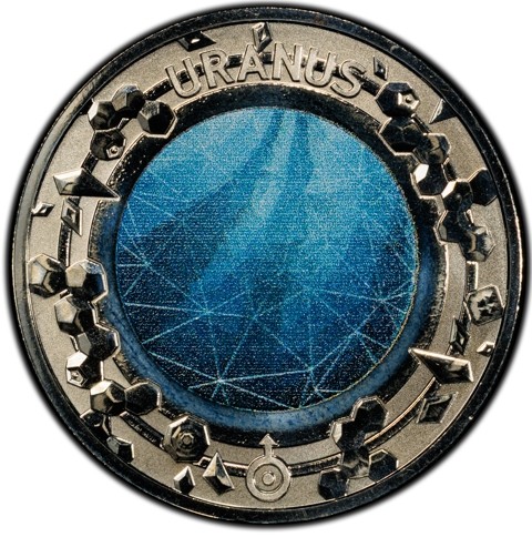 The reverses of the coins feature color-printed depictions of the planet Mercury in pad printed Blue/White and a decorative border representing crystal shapes. Planetary Symbol of Uranus below.