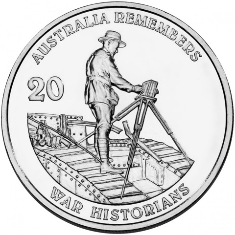 The reverse depicts an Australian official photographer, standing with a tripod and camera on a British Mark V tank, recording the advance of Australian troops through the Hindenburg Line surrounded By the text AUSTRALIA REMEMBERS above and WAR HISTORIANS below. The face value numeral 20 is to the left of the figure.