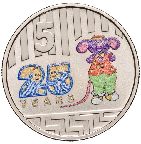 The reverse shows the colored rat as one character from the Bananas in Pyjamas children's TV show, on a background decorated with geometric motifs. The two "bananas" characters are within a large figure 25, under which the inscription YEARS. Above left, the face value 5.