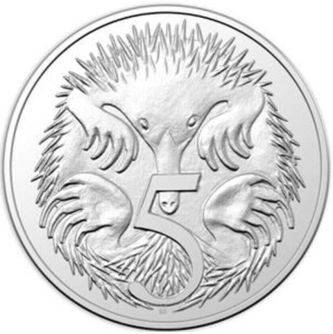 The reverse depicts an echidna (a spiny ant-eater) seen from below as it rolls into a protective ball. The denomination numeral 5 [cents] is above the lower half of the animal, below the numeral in tiny letters initials of designer (SD).