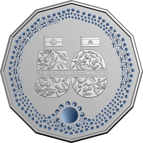 The reverse design features the large numeral (50) at center (which is the anniversary not the value), representing an Aboriginal meeting place and covered with small gum tree branches. Above the numbers, an Aboriginal and a Torres Straits Islander flag. Across the numeral, the inscription "YEARS OF NAIDOC COMMITTEE." a blue colored circle surrounded by ten curved lines below represents the gathering of individuals coming together, to form the committee in collaboration.