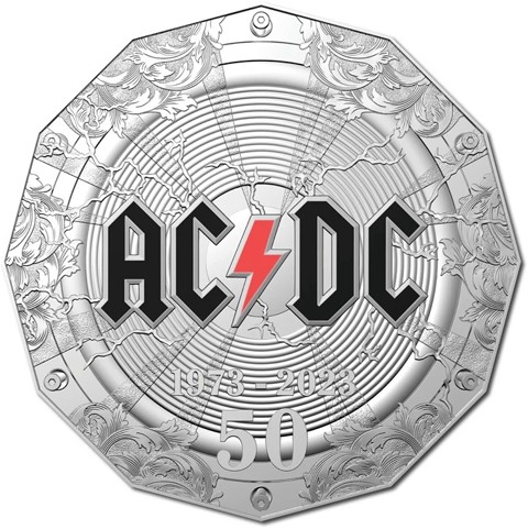 The reverse features at its center the colored logo of AC↯DC with the iconic thunderbolt separating AC and DC. The background is patterned like the thin grooves of a vinyl LP. Sparks coming out of the logo extend to the floral motifs of the rim, which is styled like a lid with six screws. Below, the anniversary dates, year of establishment (1972) and year of issue 2023, and the face value (50).