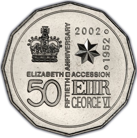 The reverse depicts St Edward's Crown, Australia's Federation Star, the dates 2002 and 1952, the denomination 50 and Royal Ciphers EIIR (for Elizabeth II Regina - Queen Elizabeth the Second) and GEORGE VI intersected by the words ELIZABETH ACCESSION and FIFTIETH ANNIVERSARY in a quaternary design. St Edward's Crown is a symbol of the Queen and Her Majesty's role as Australia's Head of State and was first used for the coronation of Charles II in 1661 and used in most coronations since that time, including that of Queen Elizabeth II. The seven-pointed Federation Star is a symbol of Australia's federal system of government, and appears on the national flag. The seven points of the Star represent the six Australian States and Territories.