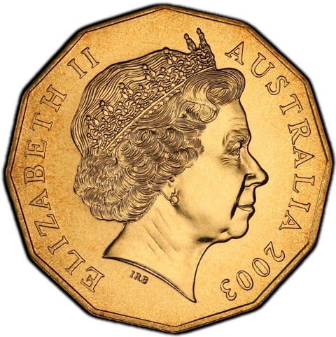 The reverse features a modernistic and slightly abstract composition of royal insignia and national emblems, highlighted by the prominent positioning of St Edward's Crown over the Queen's personal cypher: EIIR (for Elizabeth II Regina - Queen Elizabeth the Second). Below that is the numeral face value (50). These form the central panel of a triptych arrangement which can be seen as a pair of grand ceremonial doors opening out to reveal the Queen's historic reign at the left panel depicts Australia's Federation Star over the date 1953. Around left, the text · CORONATION ELIZABETH II · and at the right panel has a sprig of wattle over the date 2003. Around right, the text · FIFTIETH ANNIVERSARY ·.