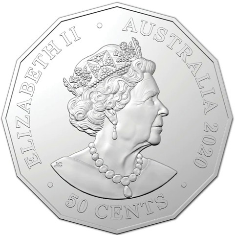 The reverse design depicts the distinct blue and yellow livery of the iconic NR27 Australian Indian Pacific train traversing its way over the tracks on the vast journey of the Sydney-Perth crossing. The train shows the distinctive wedge-tailed eagle logo on its front engine. On the lower right periphery is inscribed the text - "INDIAN PACIFIC 1970 - 2020". The denomination of the coin "50" is seen on the upper periphery. The designer's initials (SMS) are below left.
