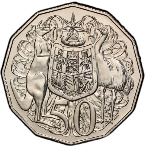 The reverse depicts Coat of Arms of the Commonwealth of Australia, based on those authorized by Royal Warrant 19 September 1912 - composed of a shield divided into six parts, each containing a representation of the badge of a State. The shield is supported by a kangaroo and an emu. The shield sits on the denomination numerals, 50; above the shield is the Federation star. The entire design is set above a field of stylized wattle leaves. Designer's initials "SD" in tiny letters are in the field below the numerals..