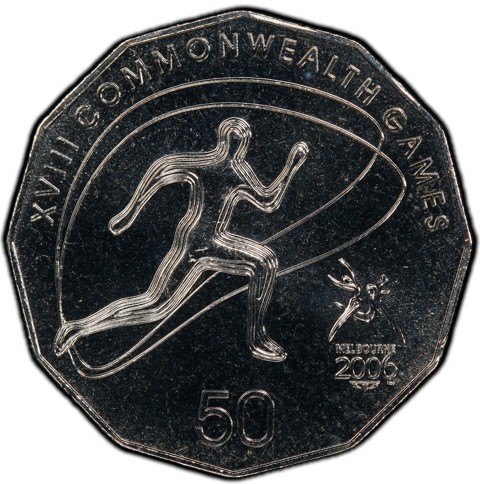 The reverse design, a central figure is a stylized line drawing of a running figure. Two interlocking freehand-style loops are placed in the background. Reading the text and other devices, from 9 o'clock to 3 o'clock: 'XVIII COMMONWEALTH GAMES' written around the curve of the rim; at 4 o'clock 'MELBOURNE 2006', is surmounted by Games logo, presented horizontally ; '50' is written horizontally, next to the rim at 6 o'clock.