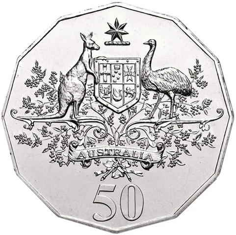 The reverse features the Australian 1912 Commonwealth Coat of Arms granted by King George V. This Coat of Arms consists of a shield depicting the badges of the six Australian States. Aside the shield are a Red Kangaroo and Emu. These animals symbolize a nation moving forward. Above the shield is a seven pointed star on a wreath, each point representing the 6 States and one for the Territories. Below are sprays of Golden Wattle and the name AUSTRALIA in a scroll. Below, the denomination 50.