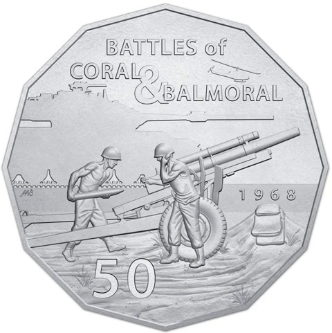 The reverse featuring a depiction of two soldiers manning a 105mm M2A2 howitzer, the number 6 gun of 102 Field Battery, 12th Field Regiment, Royal Australian Artillery along with a silhouette Centurion tank and Iroquois helicopter "Huey" in the background.
