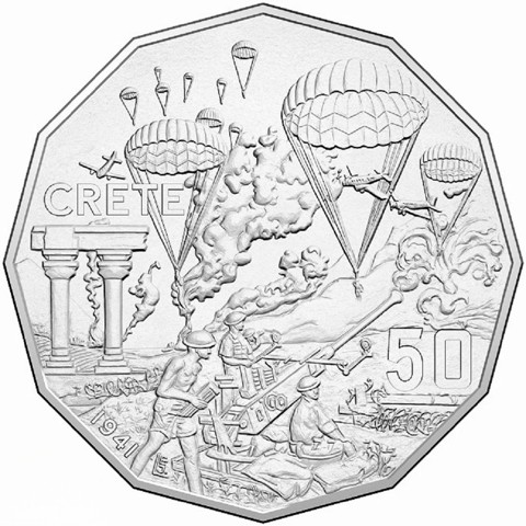 The reverse of the coin features a vivid depiction of soldiers battling with anti-aircraft gun while aircraft and airborne troops attack from above and ancient columns of Crete in the left background. The date of battle below left, and the initials of the designer (LE) below Between soldier legs. The inscription identify theme "CRETE" above left.