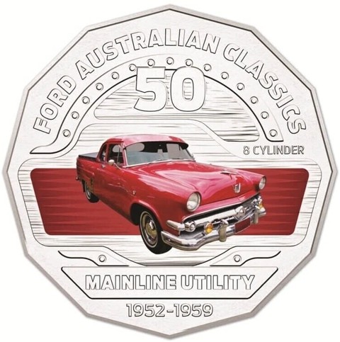 The reverse depicts an Australian-built Red Ford Mainline Utility within a medallion type set against a red background, the numeral the face value 50 above and car model below in a ribbon surrounded by text series (FORD AUSTRALIAN CLASSICS) above and dates year of beginning and finishing below.