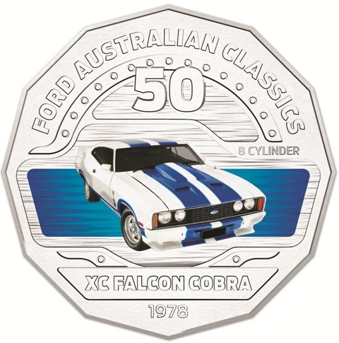 The reverse depicts an Australian-built White with Blue stripe XC Ford Falcon Coupe within a medallion type set against a blue background, the numeral the face value 50 above and car model below in a ribbon surrounded by text series (FORD AUSTRALIAN CLASSICS) above and dates year of beginning and finishing below.