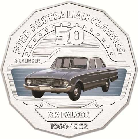The reverse depicts an Australian-built Grey XK Ford Falcon Sedan within a medallion type set against a light blue background, the numeral the face value 50 above and car model below in a ribbon surrounded by text series (FORD AUSTRALIAN CLASSICS) above and dates year of beginning and finishing below.