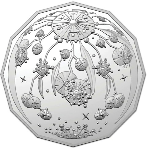 The coin's reverse features an intricate design inspired by Australia's official floral emblem, the Golden Wattle, stylized with a glittering, pollen and faux convex surface to resemble a festive bauble in an arrangement reminding of a Christmas tree decoration.