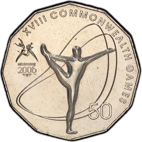 The reverse design, a central figure is a stylized line drawing of a gymnast with one leg raised. Two interlocking freehand-style loops are placed in the background. Reading the text and other devices: from 9 o'clock to 10 o'clock 'MELBOURNE 2006', supported by Games logo, presented horizontally ; from 10'clock to 4o'clock 'XVIII COMMONWEALTH GAMES' written around the curve of the rim; at 5 o'clock '50' is written horizontally, set in from the rim.