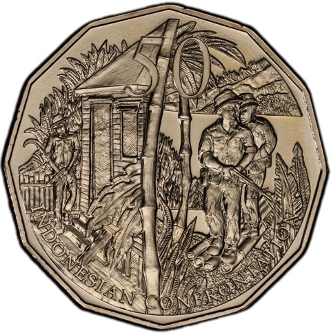 The reverse depicts Australian soldiers holding rifles patrolling in the jungle of Borneo, standing beside bamboo shoots, with a small native hut in the background. Inscription identify theme "INDONESIAN CONFRONTATION" below and face value "50" above.