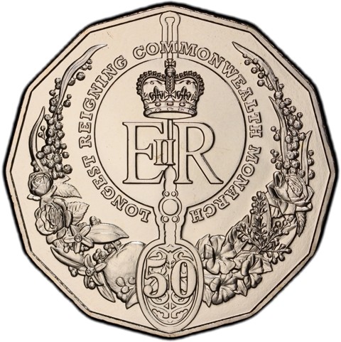 The Coin’s reverse features a modernistic and slightly abstract composition of royal insignia, highlighted by the prominent positioning of St Edward's Crown over the Queen's personal cypher: EIIR (for Elizabeth II Regina - Queen Elizabeth the Second) surround by the inscription identify theme "LONGEST REIGNING COMMONWEALTH MONARCH" below that is the numeral of denomination the face value (50), depiction of the anointing Coronation Spoon vertically and a border consisting of some of the coronation oil's (was used of neroli, jasmine, rose, cinnamon, benzoin, musk, civet and ambergris) and ingredients alongside Australia's golden wattle.