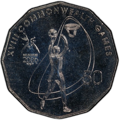 The reverse design, a central figure is a stylized line drawing of a woman shooting a netball towards a hoop. Two interlocking freehand-style loops are placed in the background. Reading the text and other devices, from 9 o'clock to 3 o'clock: 'XVIII COMMONWEALTH GAMES' written around the curve of the rim; at 4 o'clock 'MELBOURNE 2006', is surmounted by Games logo, presented horizontally ; '50' is written horizontally, next to the rim at 6 o'clock.
