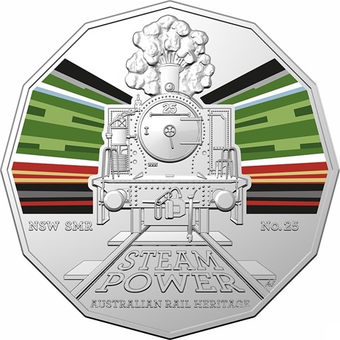The reverse portrays a front view of the NSW South Maitland Railways 10 Class No.25 steam train that worked the rich coal seams of the Hunter Valley with a colored print of the engine’s distinctive multi-color in the both sides. Below the exergue line, divided by the locomotive, the inscription "NSW SMR No.25." On three lines at center below, "STEAM POWER AUSTRALIAN RAIL HERITAGE." The designer's initials (AS) are below right.