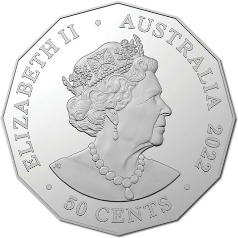 6th crowned portrait of HM Queen Elizabeth II facing right (the Commonwealth effigy), wearing the George IV State Diadem, the Coronation Necklace and Earrings framed by inscriptions “ELIZABETH II,” “AUSTRALIA, 2021” the denomination “50 CENTS.”